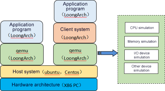 QEMU version 7.1.0 supports user-mode program emulation and full system emulation based on LoongArch. The former allows for running and debugging LoongArch-based user-mode programs on a mainstream X86 architecture.