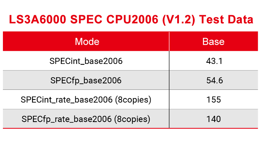 According to the test results from the electromagnetic compatibility laboratory of China Electronics Standardization Institute (CESI-EMC), the quad-core CPU, operating at a frequency of 2.5GHz, demonstrated a single-thread integer/floating point score of 43.1/54.6 in SPEC CPU 2006 base, and a multi-thread integer/floating point score of 155/140 in SPEC CPU 2006 base. The dual DDR4-3200 memory channels exhibited a bandwidth exceeding 42GB/s, with Unixbench measurements surpassing 7,400 points. These test results, evaluated holistically, suggest that the overall performance of the LS3A6000 processor rivals that of Intel's 10th generation quad-core processors launched in 2020.