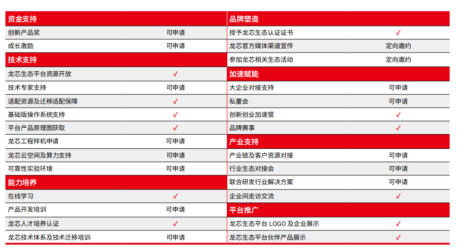 龍芯生態(tài)伙伴計劃秉承著開放龍芯支撐體系、共建生態(tài)伙伴關(guān)系、共贏龍芯產(chǎn)業(yè)生態(tài)的戰(zhàn)略宗旨,打造了生態(tài)伙伴企業(yè)“認(rèn)識龍芯、學(xué)習(xí)龍芯、使用龍芯、聯(lián)合推廣、共同成長”的全過程伙伴成長體系,并配套提供涵蓋加速賦能、人才培養(yǎng)、產(chǎn)業(yè)支持、技術(shù)支持、基金支持等豐富的支持權(quán)益體系,鼓勵各企業(yè)在龍芯生態(tài)內(nèi)互相鏈接與協(xié)作,形成“立體交叉、網(wǎng)狀延伸”的龍芯中小企業(yè)發(fā)展集群。