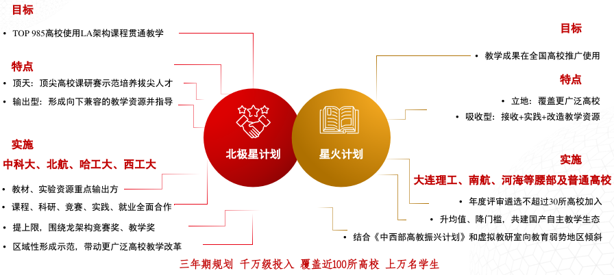 2023年龍芯中科聯(lián)合中國科學技術大學、北京航空航天大學聯(lián)合發(fā)起“北極星”計劃,該計劃旨在推動基于LoongArch自主指令系統(tǒng)的計算機基礎學科建設,以國內(nèi)一流高校課程體系建設為標桿樣本,輸出向外兼容的教學資源,為全國計算機教育提供參考借鑒和發(fā)展路徑示范?!氨睒O星”計劃產(chǎn)出的計算機組成原理/計算機體系結(jié)構(gòu)、操作系統(tǒng)、編譯原理等核心課程的教材(含教學課件)、實驗(含實驗指導手冊)、管理平臺(含自動評判、作業(yè)收發(fā)統(tǒng)計等功能)、慕課及開源社區(qū)等教學資源將在2024年陸續(xù)推出。