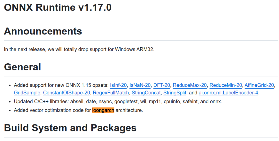 在ONNX Runtime 社區(qū)1.17.0版本的研制過程中,龍芯中科技術(shù)團(tuán)隊與社區(qū)保持緊密合作,期間向ONNX Runtime社區(qū)代碼倉庫提交了7697行代碼,對矩陣乘法、卷積、轉(zhuǎn)置等核心算子進(jìn)行深度向量優(yōu)化。在社區(qū)支持下,龍架構(gòu)優(yōu)化代碼通過了檢視、測試驗證等質(zhì)量保證流程,ONNX Runtime社區(qū)自1.17.0版本起正式實現(xiàn)對龍架構(gòu)的原生支持。