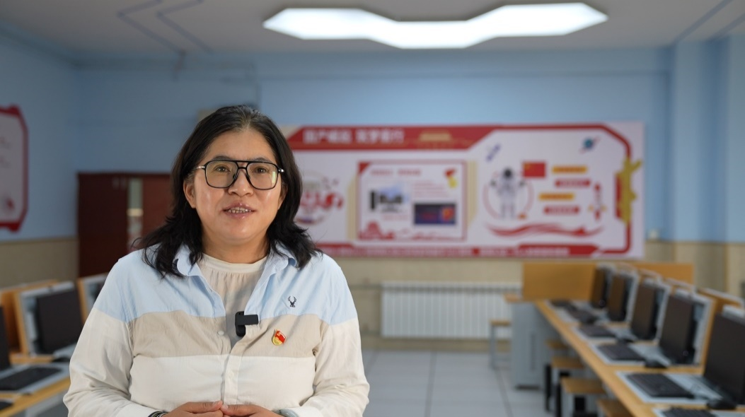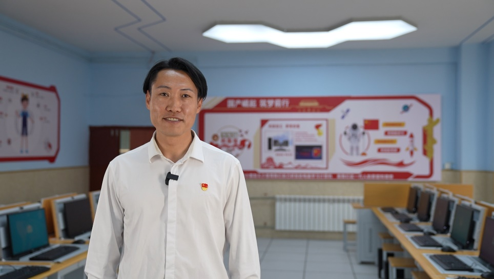 教室外,“北京-拉薩基礎(chǔ)教育信創(chuàng)聯(lián)合示范基地”的牌匾熠熠生輝;教室內(nèi),援藏教師王軍正為同學(xué)們介紹我國信息科技自主創(chuàng)新的最新成果及手邊嶄新的課堂教學(xué)設(shè)備。