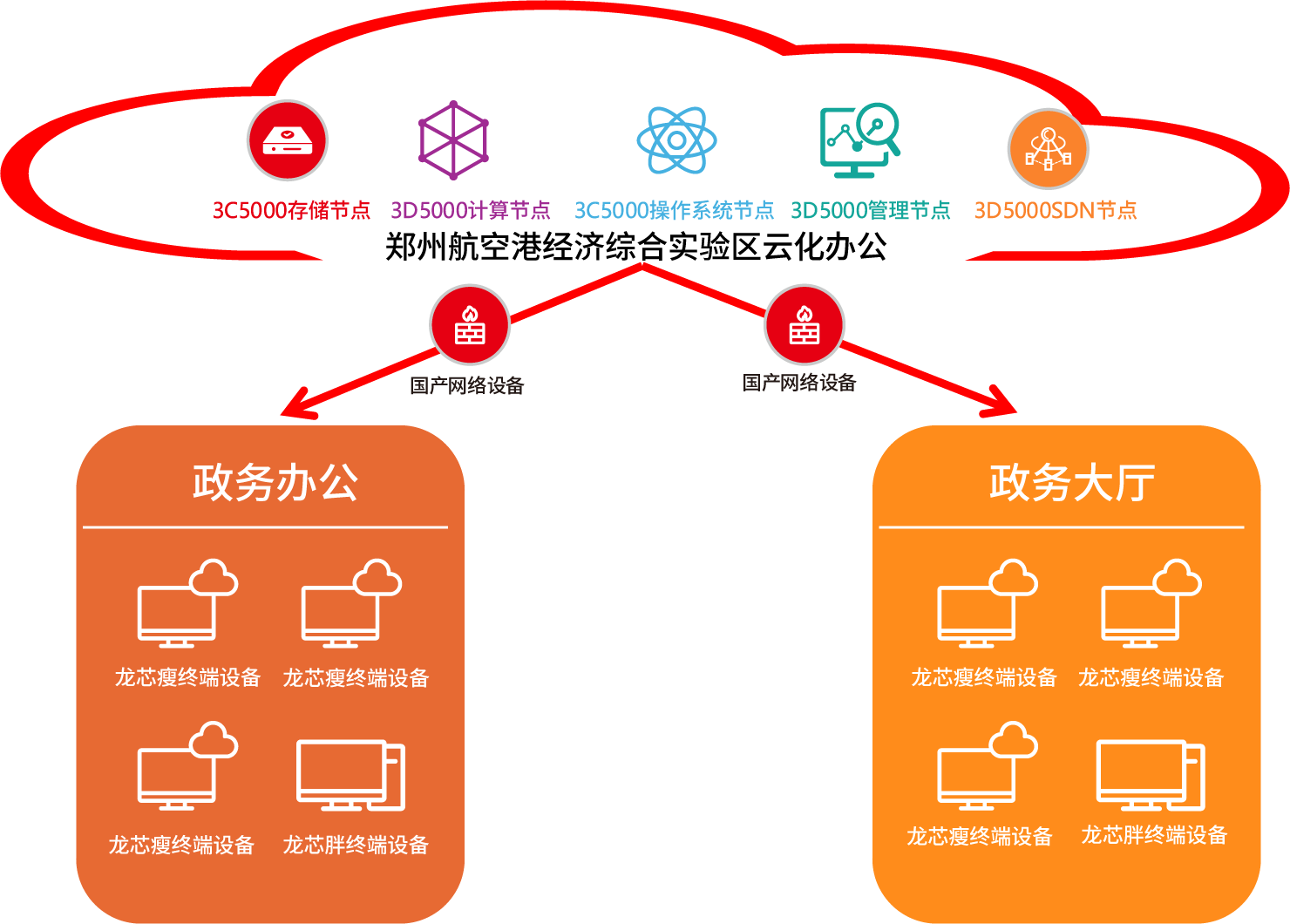 項(xiàng)目充分發(fā)揮龍芯3C5000、3D5000等處理器的卓越性能優(yōu)勢(shì),成功構(gòu)建了集存儲(chǔ)、計(jì)算、操作系統(tǒng)、管理和軟件定義網(wǎng)絡(luò)(SDN)等關(guān)鍵節(jié)點(diǎn)于一體的云端資源池,完成從前端、網(wǎng)絡(luò)設(shè)備到后端的全鏈條國(guó)產(chǎn)化替代。這一高效、穩(wěn)定的云平臺(tái),以龍芯服務(wù)器為支撐,部署龍芯云桌面瘦終端和胖終端,將支撐鄭州航空港日常辦公和信息化建設(shè),為政務(wù)辦公、政務(wù)大廳等多樣化場(chǎng)景提供優(yōu)質(zhì)服務(wù)。