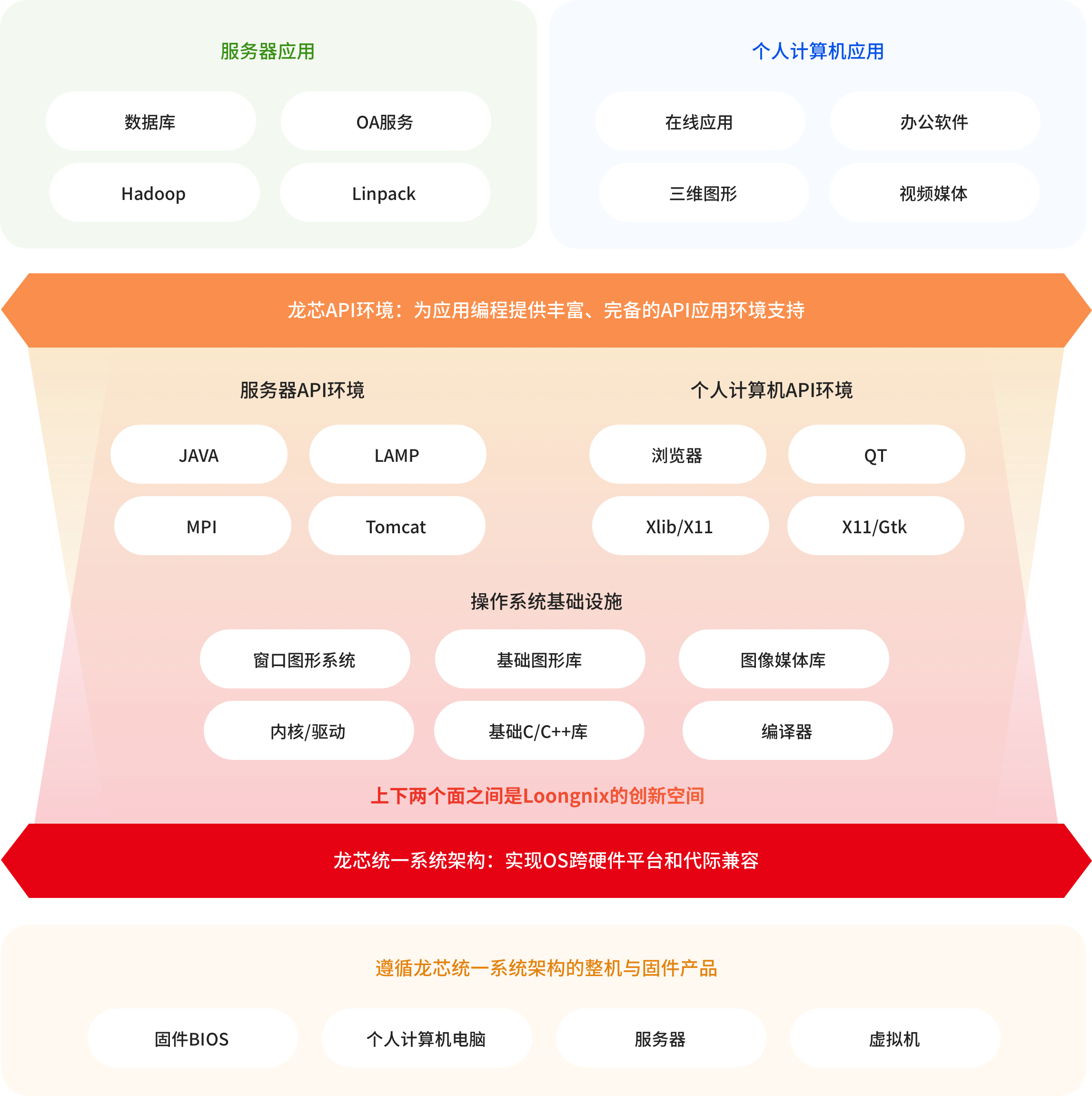 Loongnix的發(fā)展采用了“遵循統(tǒng)一系統(tǒng)架構(gòu)和規(guī)范API應(yīng)用編程環(huán)境”的技術(shù)路線。其中“系統(tǒng)架構(gòu)”是操作系統(tǒng)和整機(jī)硬件間的界面,“API編程環(huán)境”是操作系統(tǒng)與應(yīng)用軟件間的界面?;凇洱埿窘y(tǒng)一系統(tǒng)架構(gòu)規(guī)范》,發(fā)布支持ACPI標(biāo)準(zhǔn)的UEFI固件和系統(tǒng),實(shí)現(xiàn)操作系統(tǒng)跨主板整機(jī)兼容和CPU代際兼容,達(dá)到“任意一套龍芯操作系統(tǒng)可以安裝在不同廠商不同時(shí)期龍芯整機(jī)”的目標(biāo)。